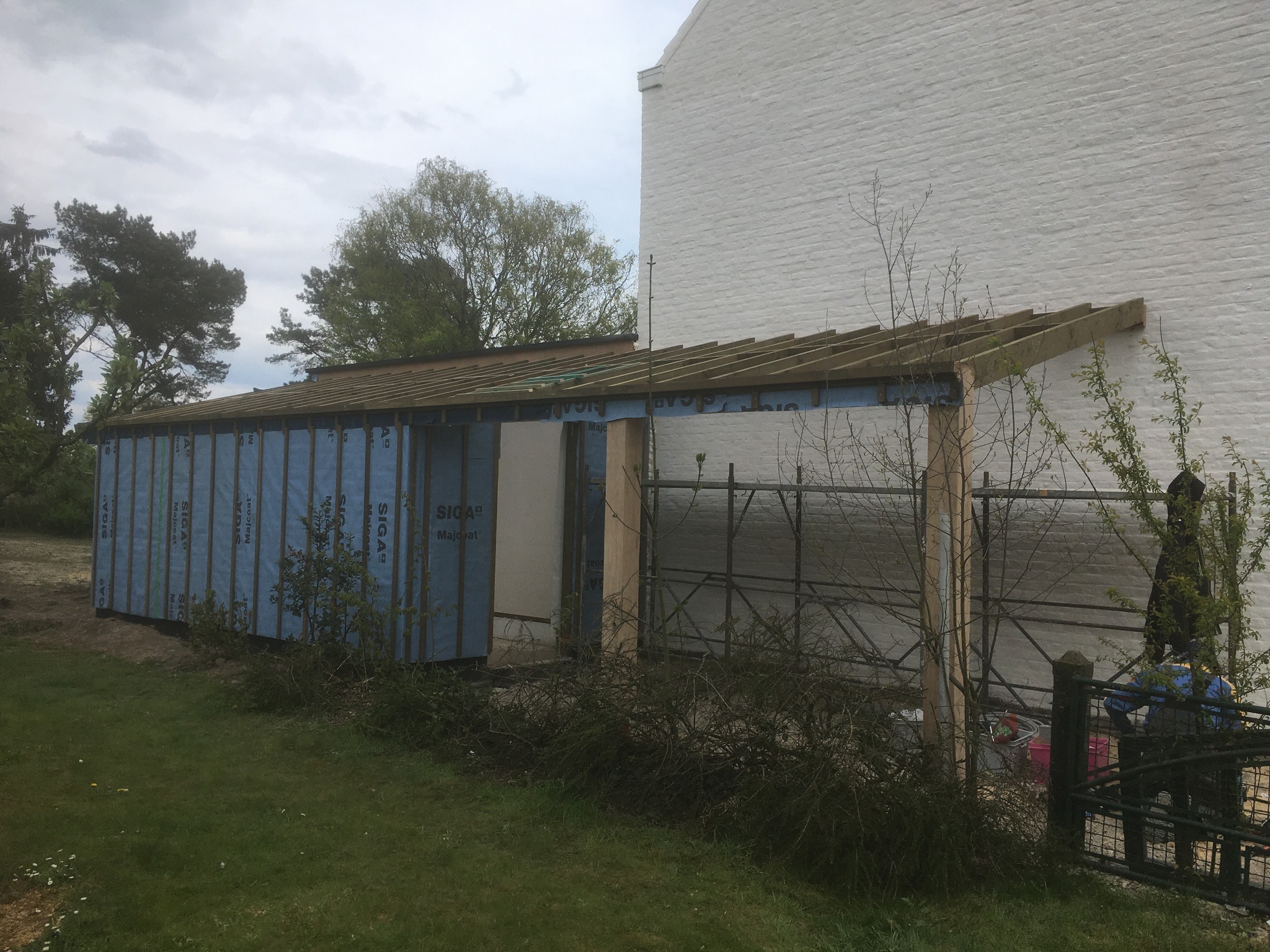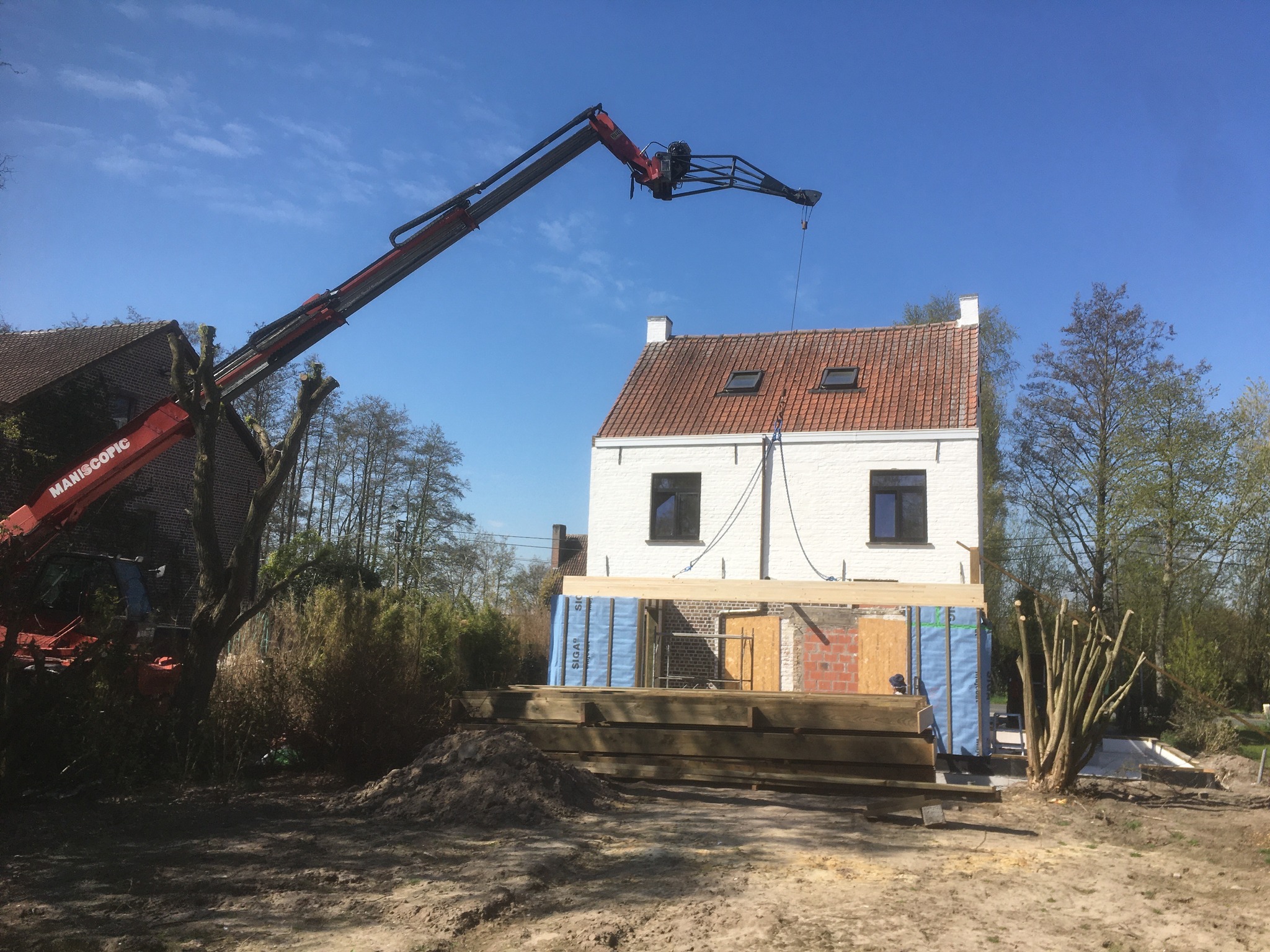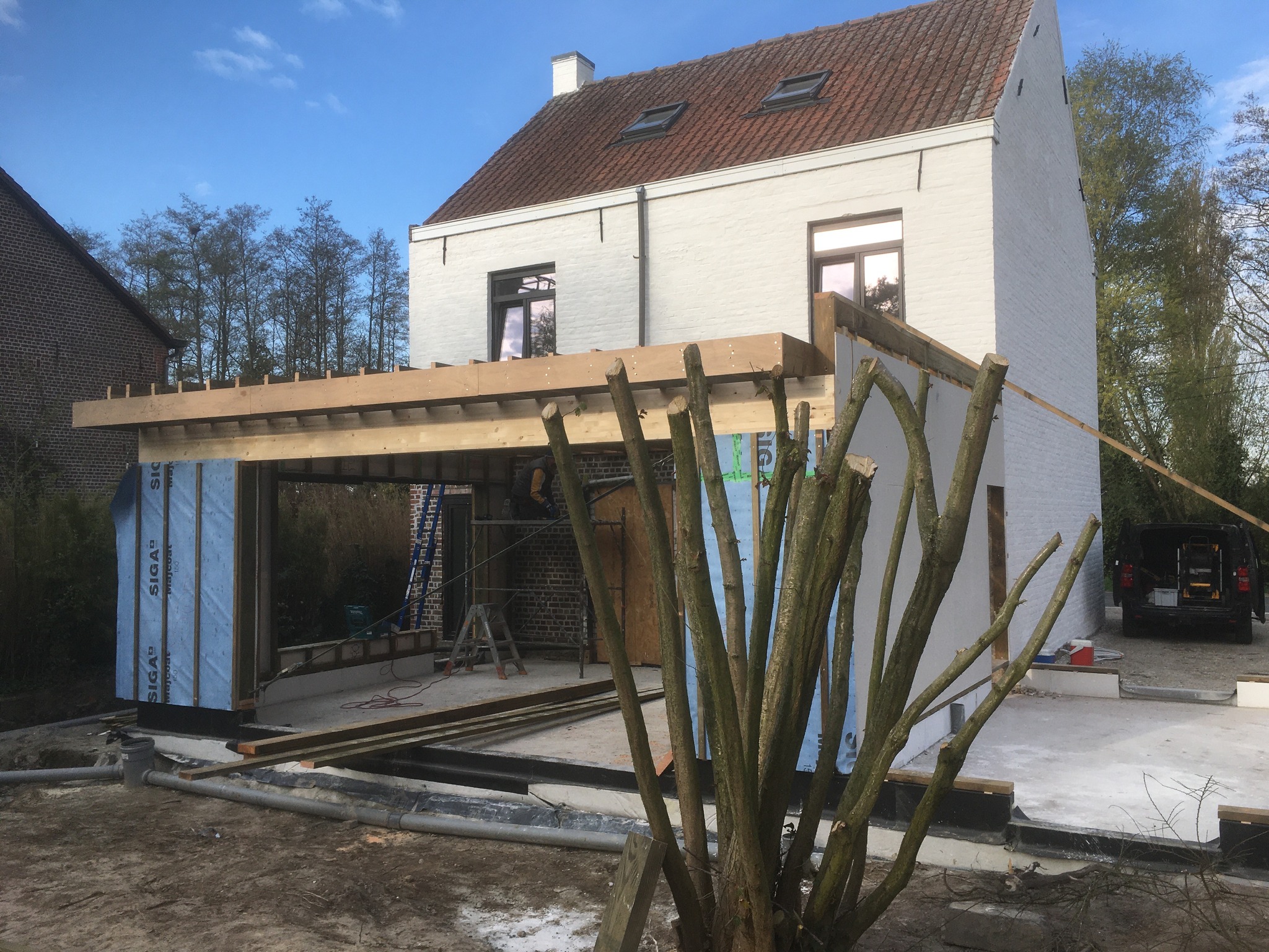 Aanbouw van 49m2 met een bijhorende carport. Hier plaatste ECOPREFAB het houtskelet en nam de dakwerken voor zich.