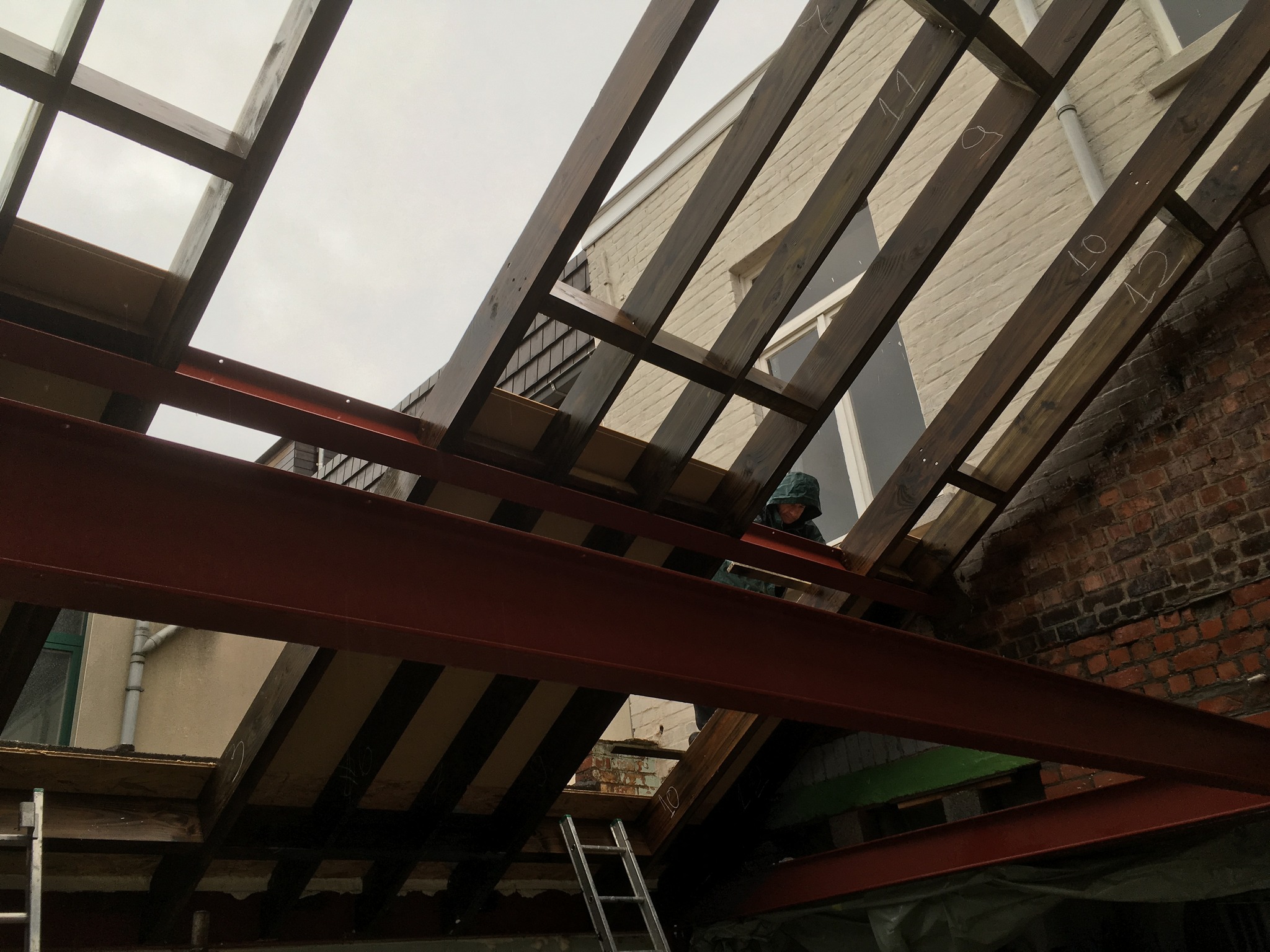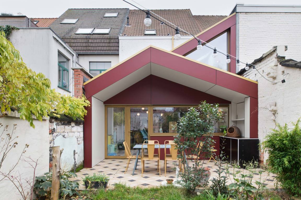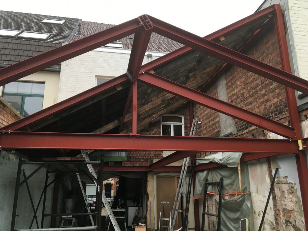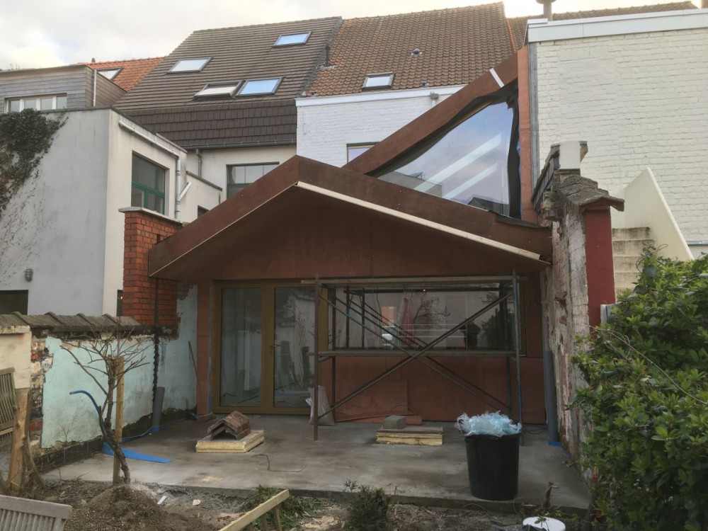 Aanbouw rijhuis te Sint-Amandsberg. Stalen constructie in combinatie met houtskeletbouw. Mét een mezzanine.