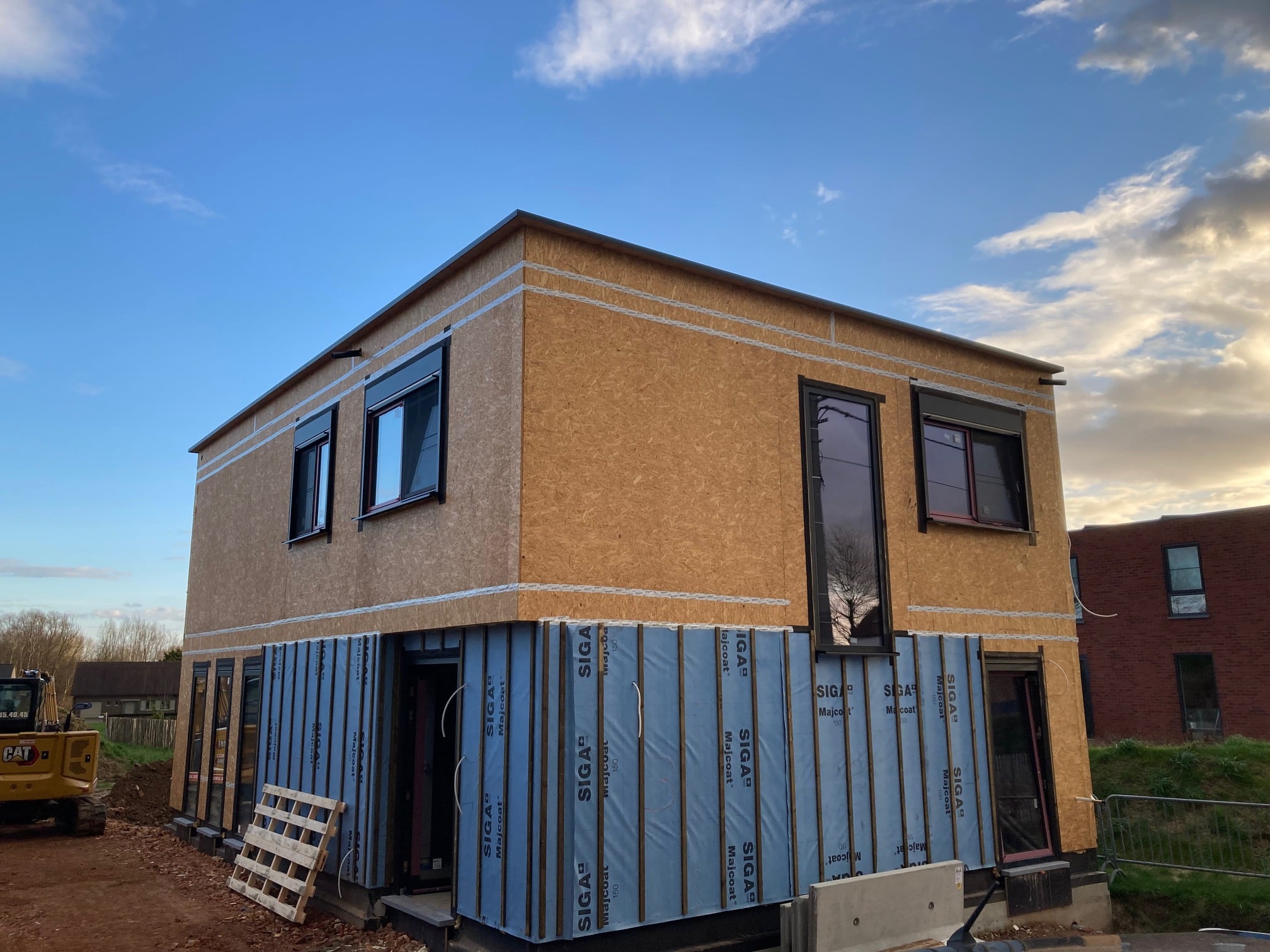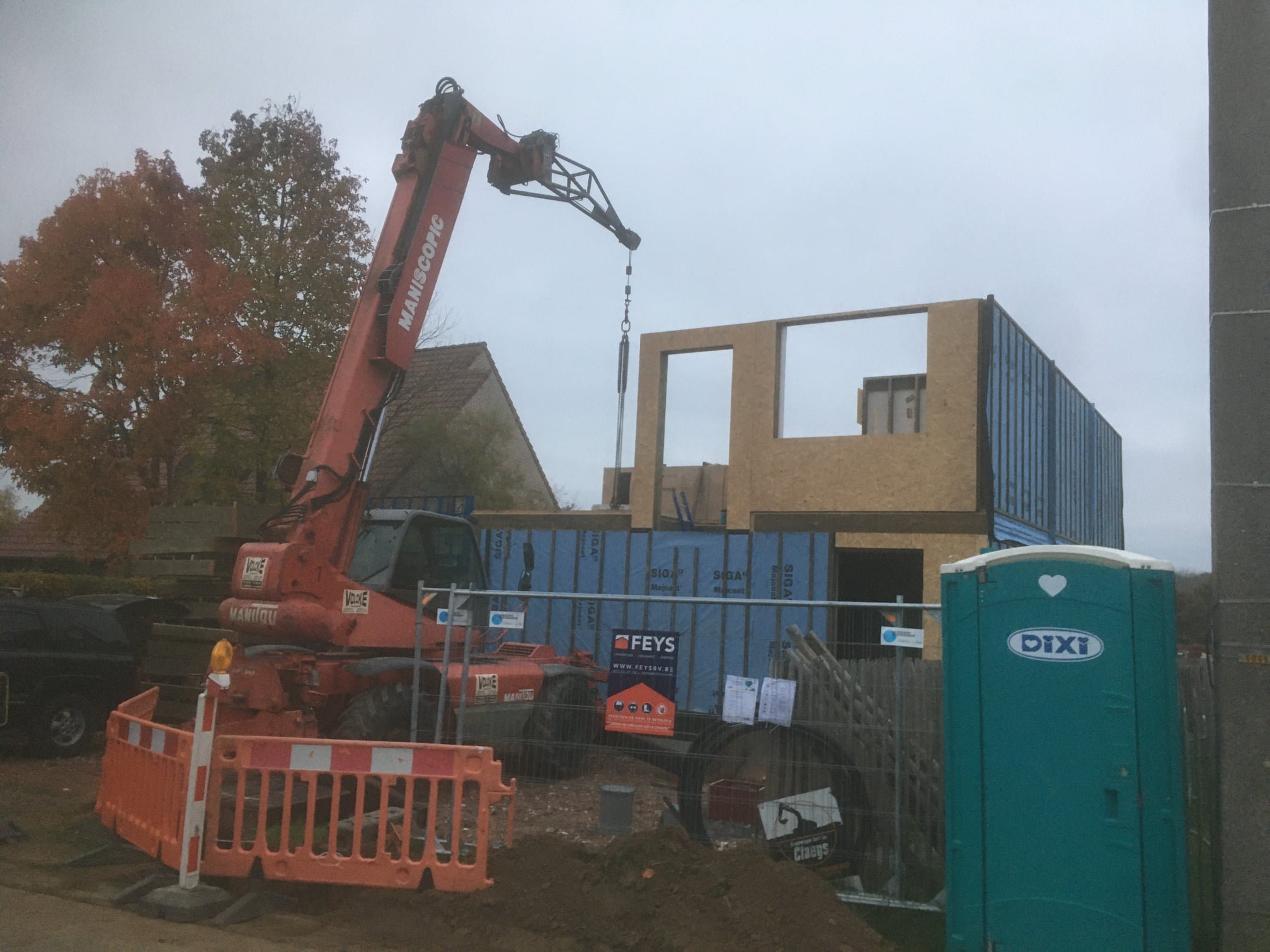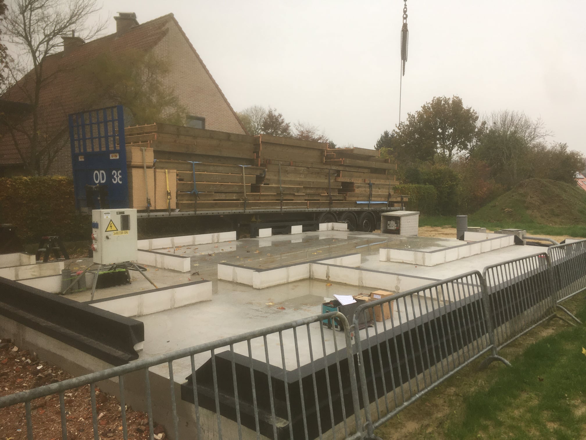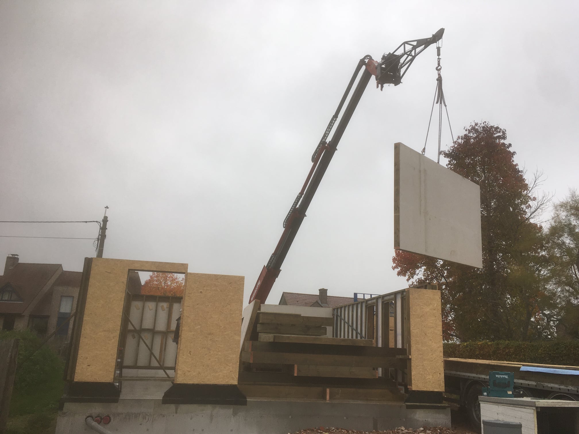 Plaatsing van een nieuwbouwproject te Oosterzele. Hier neemt ECOPREFAB de funderingen, houtskelet, plaatsen ramen en de binnenafwerking voor zich.
